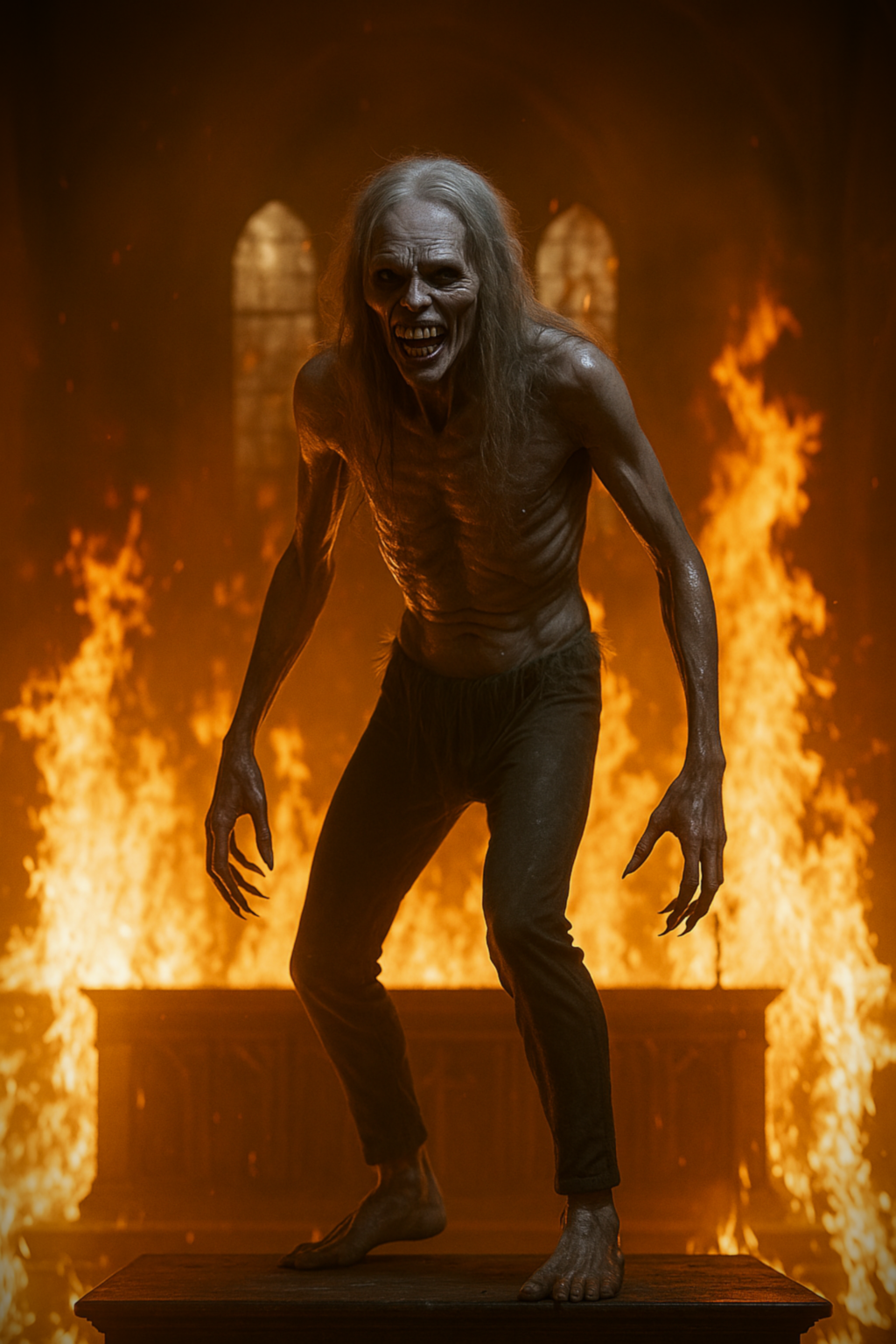 La criatura se puso de pie sobre el altar, y cuando miro a su alrededor, vio que las llamas envolvían por completo la iglesia. Su piel blanquecina y translúcida empezaba a sudar por el calor del fuego.